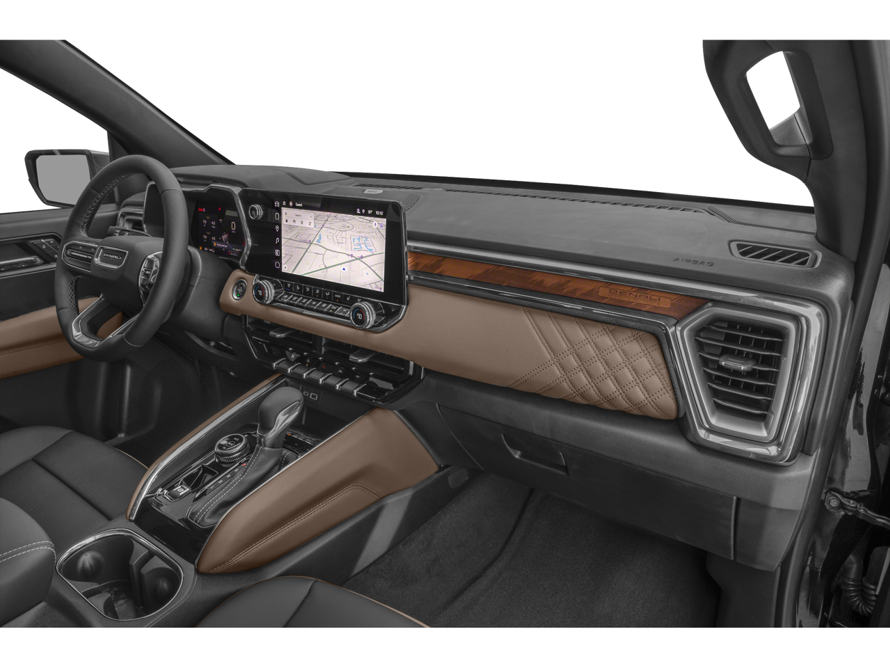 The Canyon Denali's bold, distinctive styling commands attention on the road. With its sleek black exterior and chrome accents, this truck exudes a refined and confident presence. Step inside the well-appointed cabin, and you'll be surrounded by premium materials, including genuine wood and leather-appointed seating.